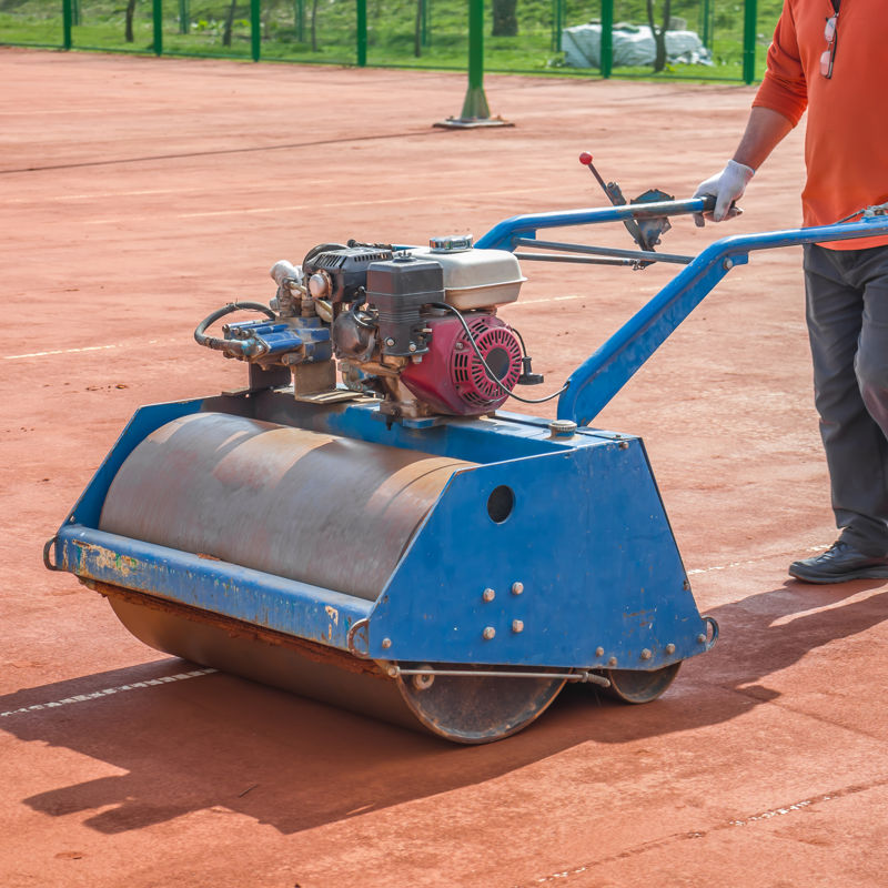 Speciale baanbezems voor vloeren met granulaatinvulling reinigen het tapijt in de tennishal...